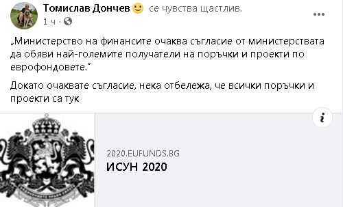 „Докато очаквате съгласие, нека отбележа, че всички поръчки и проекти са тук“, написа Дончев във Фейсбук и публикува препратка към сайта ИСУН 2020.