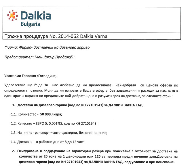 Дружеството е обявило търг за "Осигуряване и поддържане на гарантиран резерв при поискване с готовност за доставка на количества от 20 тона 1 денонощие или 120 за периода преди почивни дни. Доставка на дизелово гориво за "Далкия Варна" ЕАД под условие и при поискване".