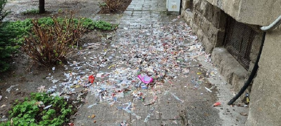 Потърпевшите жители на крайдунавския град споделиха снимки в социална мрежа на боклука, който болният човек изсипва пред входа на блока. Кооперацията се намира в кв. „Калето“ в областния град.