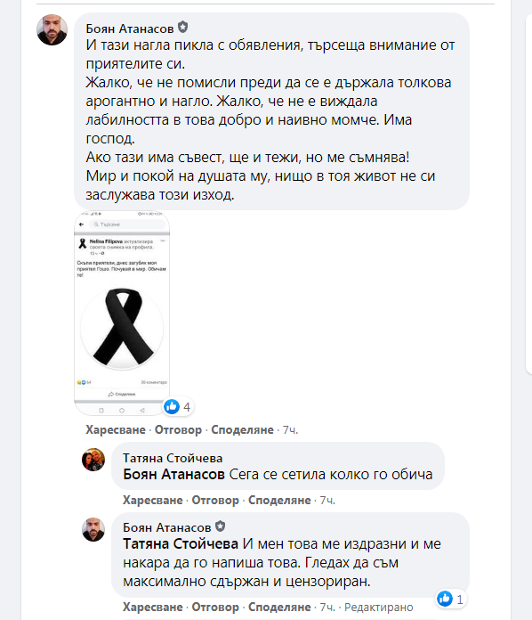 Жалейката, която Нелина качва часове след смъртта на Георги, предизвика жестоки коментари по неин адрес. Боян Атанасов пише: "И тази нагла пикла с обявления, търсеща внимание от приятелите си. Жалко, че не помисли преди да се е държала толкова арогантно и нагло. Жалко, че не е виждала лабилността в това добро и наивно момче. Има господ. Ако тази има съвест, ще и тежи, но ме съмнява! Мир и покой на душата му, нищо в тоя живот не си заслужава този изход". Татяна Стойчева пък се възмущава: "Сега се сетила колко го обича".
