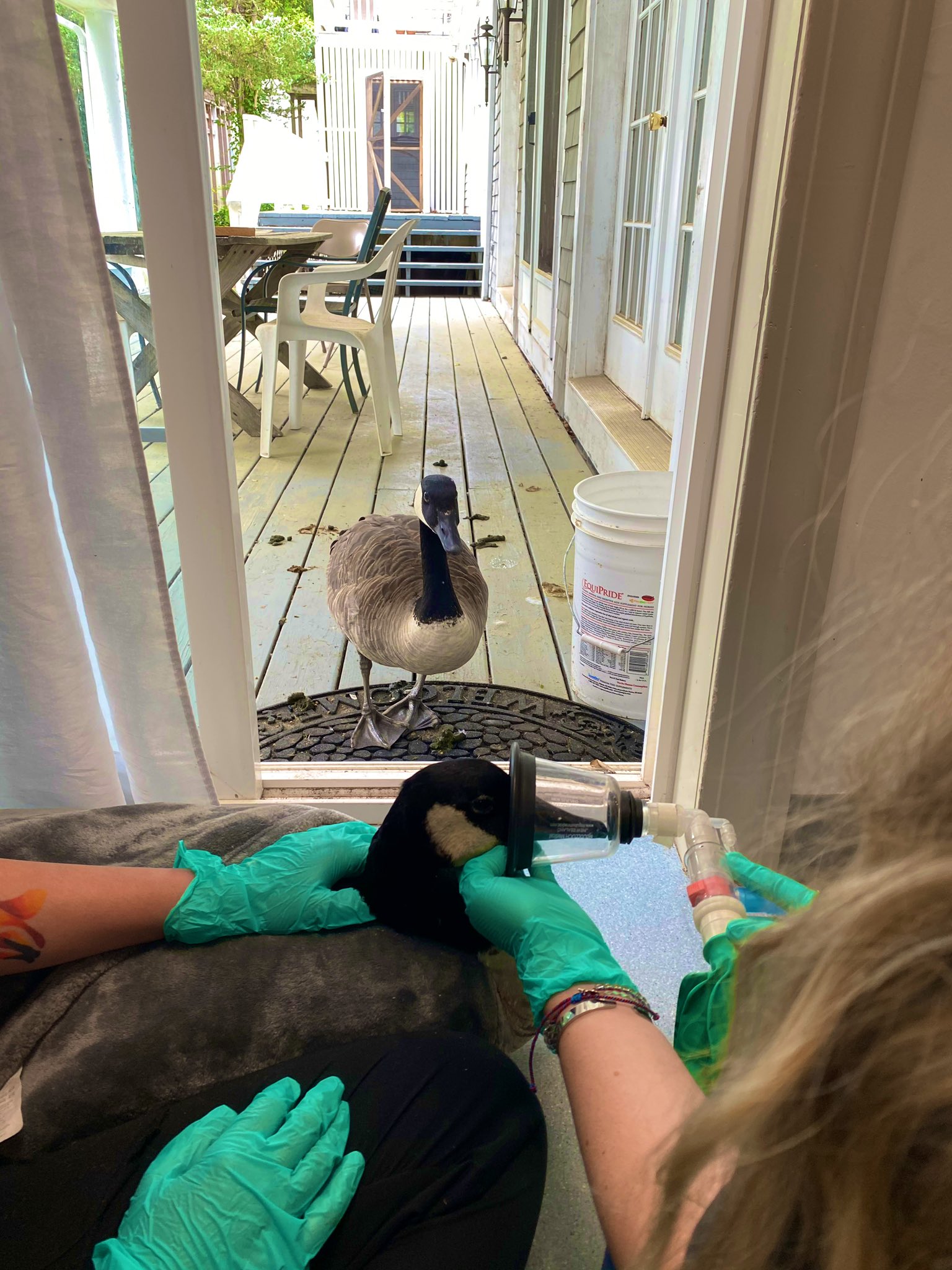 Арнолд вече е поставен на операционната маса, когато ветеринарите чуват почукване на вратата. Оказва се, че зад стъклото стои гъска, която от доста време живее в езерото с него.