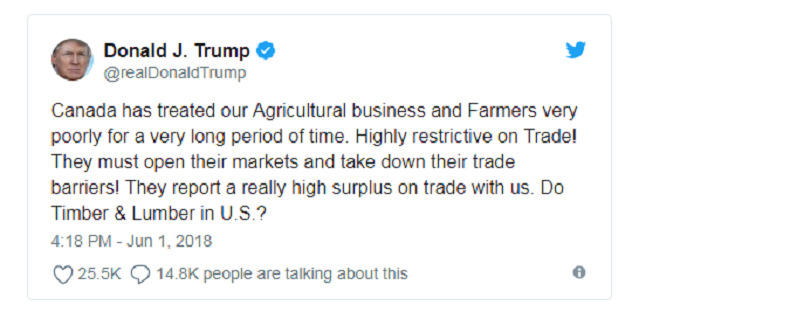 "Канада се отнасяше много зле с нашите фермери и селскостопанския бизнесв продължение на много дълъг период от време. Много ограничения за търговията! Те трябва да отворят пазарите си и да премахнат търговските си бариери! Те съобщават за наистина висок излишък от търговията с нас", написа Тръмп в профила си в "Туитър".