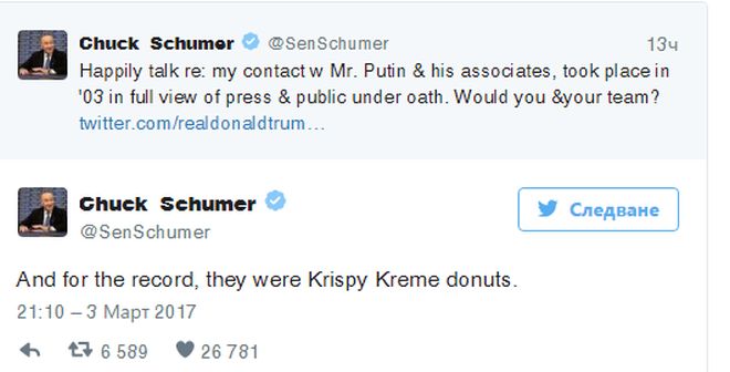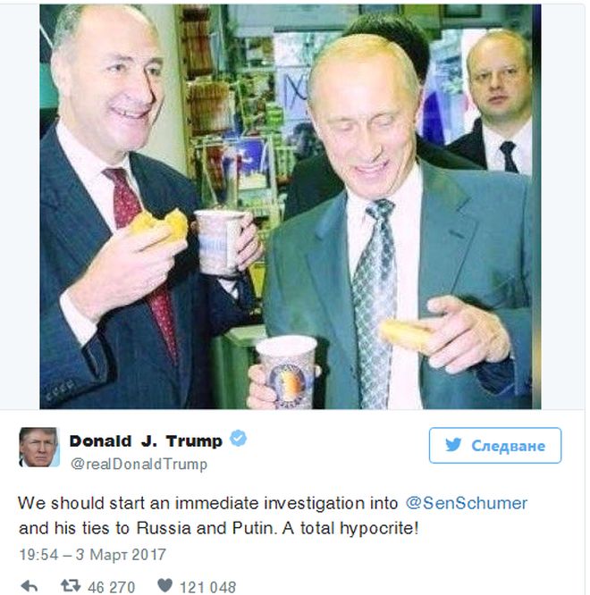 Тръмп е качил в Туитър снимка на Шумър на събитие с Путин в Ню Йорк през 2003 г. На нея се вижда как двамата държат понички в ръце.