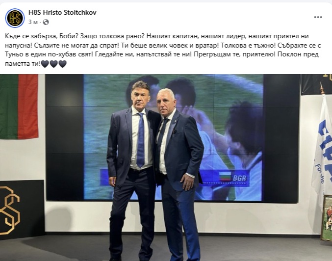 "Къде се забърза, Боби? Защо толкова рано? Нашият капитан, нашият лидер, нашият приятел ни напусна! Сълзите не могат да спрат! Ти беше велик човек и вратар! Толкова е тъжно! Събрахте се с Туньо в един по-хубав свят! Гледайте ни, напътствай те ни! Прегръщам те, приятелю! Поклон пред паметта ти", написа във Фейсбук Стоичков.