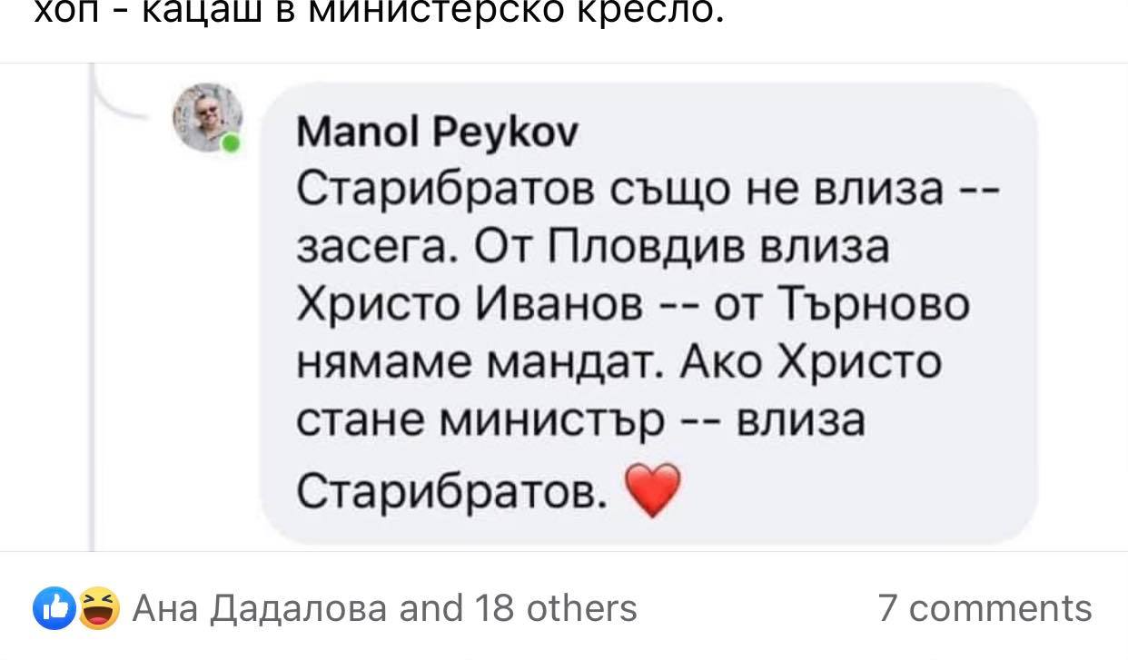 От размишленията му става ясно, че Христо Иванов преговаря с ПП за министерско кресло и вероятно иска от тях да го направят правосъден министър. Ако това станело пък, колегата на Пейков Старибратов, който също бе фантом в предишния парламент и няма дори едно изказване от трибуната, щял отново да е депутат.