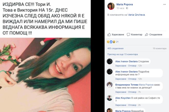 "Издирва се Тори И. !!! Това е Виктория, на 15 г. Днес изчезна следобяд. Ако някой я е виждал или намерил, да ми пише веднага! Всякаква информация е от помощ!!!"