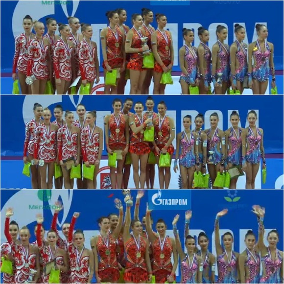 Домакинът Русия остана на второ място с 34.600 (17.800 на ленти и 16.800 на обръчи и бухалки). Трети е ансамбълът на Израел – 33.700 точки.