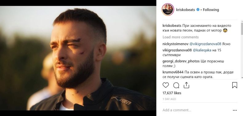 Към написаното има и кадър, на който си личат две малки рани на лицето. За по-малко от 24 часа снимката събра 16 000 харесвания и стотици коментари от негови фенове, които с нетърпение очакват новото парче.