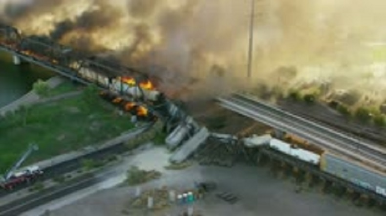 Локомотивът и няколко цистерни са паднали в реката, която минава през центъра на града. Димът от избухналия пожар бил толкова гъст, че властите временно са затворили съседната магистрала, предаде Нова.