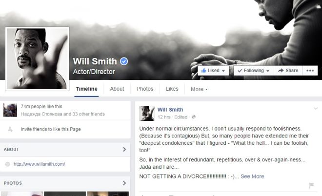 "При обичайни обстоятелства обикновено не отговарям на глупости (защото е заразно). Толкова много хора обаче изразиха съчувствието си, че осъзнах, че аз също мога да бъда неразумен. Така че, в интерес на досадно повтарящите се отново и отново глупости... Джейда и аз не се развеждаме!”, написа актьорът във "Фейсбук".