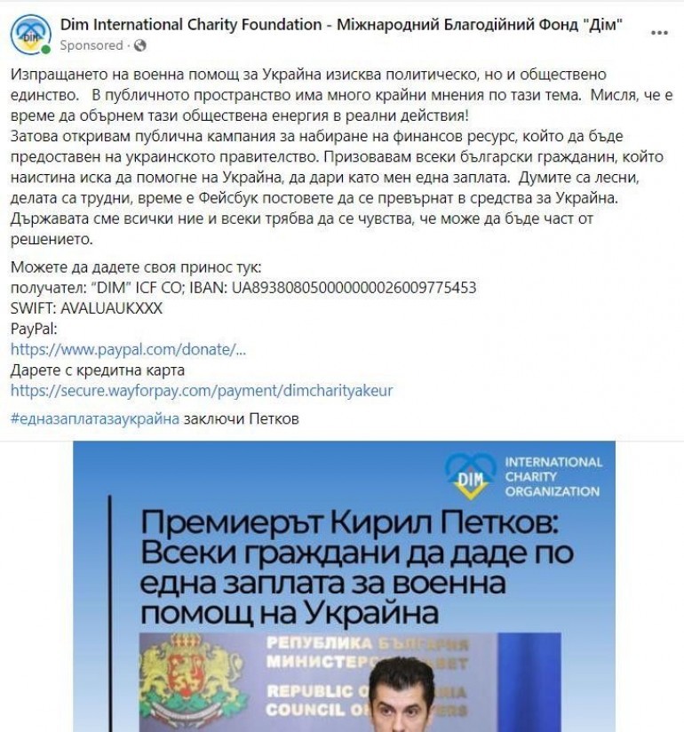 Украинската фондация "Dim Cherity" споделя в социалните мрежи снимка с призива на премиера Кирил Петков, но с друга банкова сметка.