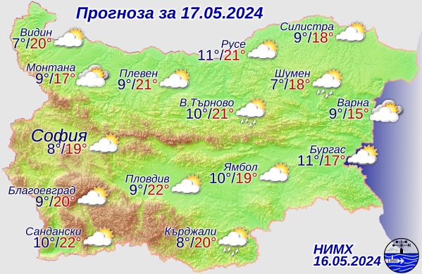 През нощта преобладаваше облачно време, на места със слаби валежи от дъжд. Сутринта в отделни райони на Западна България днес ще се образува мъгла. Минималните температури ще са между 6° и 11°, в София – около 8°. През деня превалявания ще има само на отделни места, а в следобедните часове облачността над много райони ще се разкъса и ще намалее до предимно слънчево време. Вятърът ще се задържи от изток-югоизток, ще е слаб, в Източна България – до умерен. Максималните температури ще са предимно между 17° и 22°, в София – около 19°. Това съобщават от Националния институт по метеорология и хидрология (НИМХ).