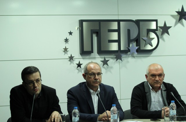 Антон Тодоров (в средата) с Тома Биков и Димитър Главчев от ГЕРБ на брифинг в централата на партията