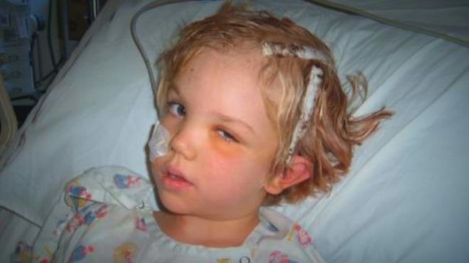 На една от снимките, които майка му публикува в интернет след операцията – детето бе отворило очи след процедурата и изглеждаше толкова смазано, пребито и объркано – половината му мозък току що бе премахнат.