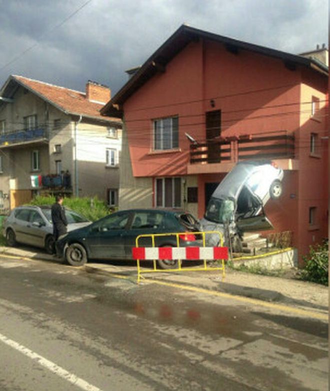 Уникално! След зрелищна катастрофа в Банкя, кола "кацна" върху къща (СНИМКИ)