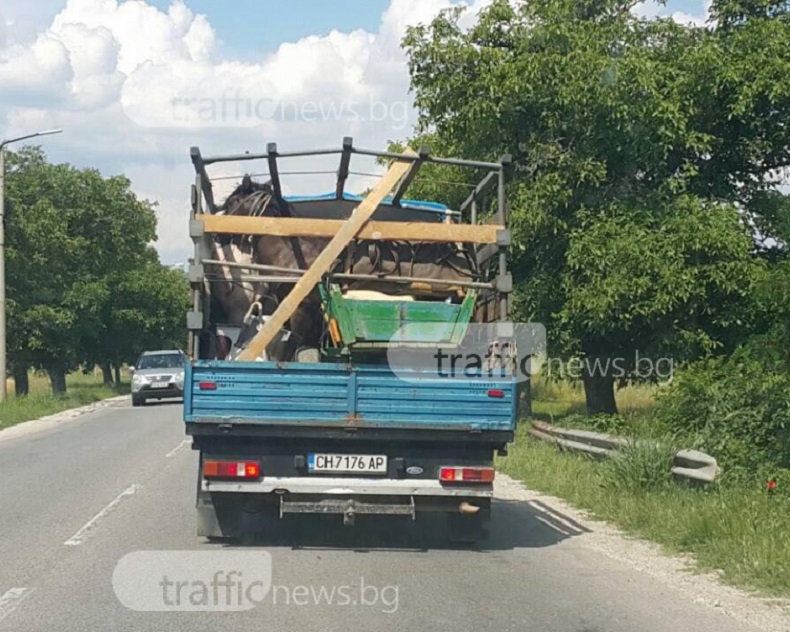 Животното заедно с каруцата е натъпкано в камион, който пътува между Карлово и Сопот. За безопасност на добичето е сложена импровизирана преграда – две греди, които трябва да послужат за защита не само на коня, но и на останалите водачи на пътя, в случай че животното тръгне да пада или само да излиза. Пълен абсурд, който може да доведе до сериозен инцидент.