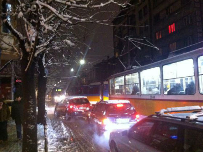 Движението на трамваите по ул. "Алабин" до Съдебната палата в София тази вечер бе блокирано. Причината бе падналият обилен снеговалеж, който прекъсна връзката между контактната мрежа и токоприемниците на трамвай №5 (в посока "Княжево"). Същевременно четири тролея №11 спряха движението си по бул. "Васил Левски" - заради лошите пътни условия.
