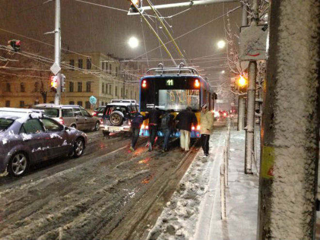 В същото време по бул. "Васил Левски" - на пресечката с бул. "Дондуков" (посока паметника на Васил Левски) - четири тролея №11, заради лошите пътни условия и неопесъчения път, се затрудниха при изкачването на булеварда и се наложи пътници и минувачи буквално да бутат превозните средства, за да продължат маршрута си.