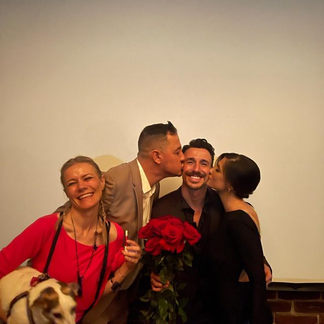 Кадърът е направен по време на партито по случай финала на успешното шоу. Виктор е в средата и получава целувки и по двете бузи - от едната страна е продуцентът на шоуто, а от другата - Александра Гърдева, която се разписа с най-много срещи с мачото по време на целия сезон на предаването.