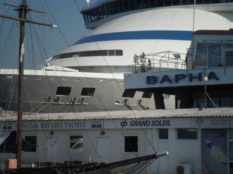 Той буквално засенчи съоръжението, макар да не е от най-големите лайнери. "AIDA aura" е построен през 2003 г. във Финландия. Дължината му е 202,85 метра, широчината – 28,10 метра, а броят на палубите му е 12.