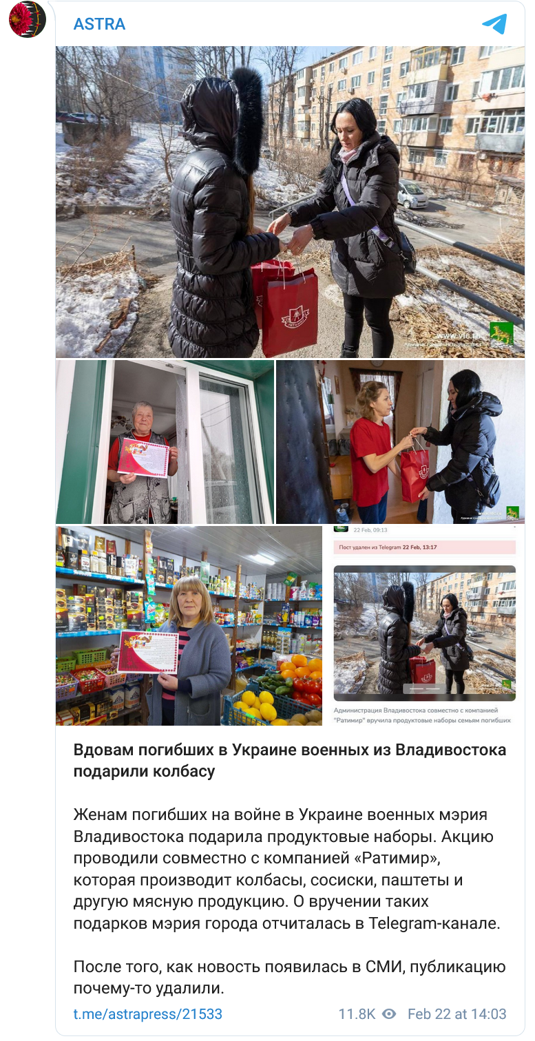 Вдовици на руски войници от Владивосток, загинали в Украйна получиха салами като дарения от общината.