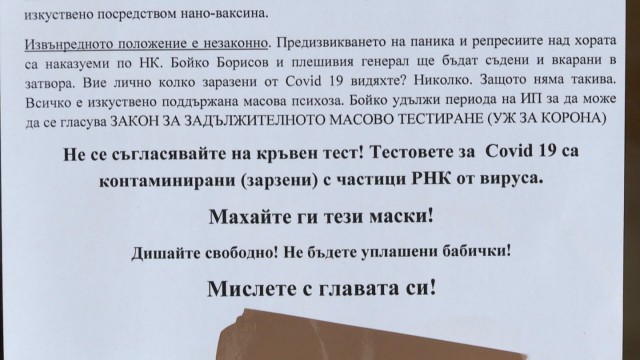 В листовките се твърди, че зараза не съществува. Освен това гражданите са призовани да не носят маски и да отказват да бъдат тествани за коронавирус.
