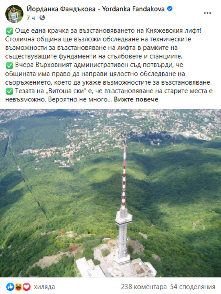 "Тезата на „Витоша ски“ е, че възстановяване на старите места е невъзможно. Вероятно не много сигурни в твърденията си, те обжалваха решението на две поредни инстанции. Възстановяване по съществуващо положение е най-бързият начин за пускане на лифта. Докато чакахме решенията на съда, заедно с министъра на земеделието г-жа Танева намерихме още един вариант за възстановяване на лифта. Надявам се, че ще излезем от омагьосания кръг, в който се обжалва всеки акт за възстановяване на лифта, и "Витоша ски" ще докажат с действия намерението си, което засега е само на думи", съобщи още столичният кмет.