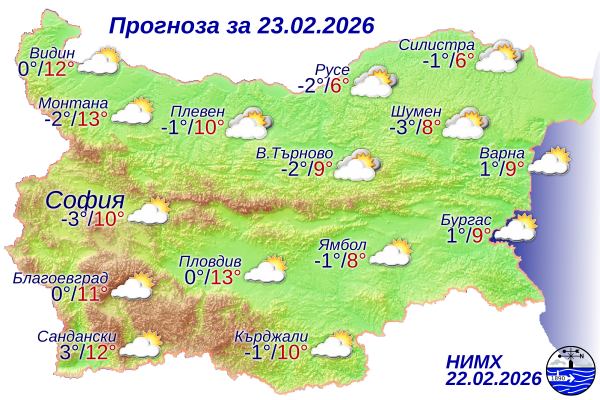 Минималните температури тази сутрин ще бъдат между минус 4° и 1°, в отделни райони на Северна България, където ще бъде тихо, по-ниски – между минус 5° и минус 8°, в София – около минус 3°.