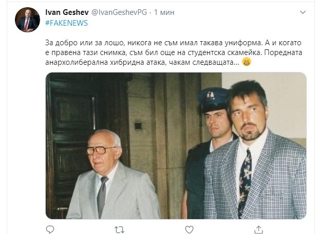 "За добро или за лошо, никога не съм имал такава униформа. А и когато е правена тази снимка, съм бил още на студентска скамейка. Поредната анархолиберална хибридна атака, чакам следващата…", отговори на атаката главният прокурор Ивав Гешев в профила си в Туитър.