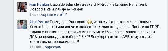 А Алекс Петров е категоричен: "Рамадане, Рамадане, ясно е, че хората харесват повече Москов! Но така или иначе двамата сте един дол дренки. Плюхте по ГЕРБ половин година, а накрая им се нагъзихте! А и колко процента спечели ДСБ на последните избори!? 3-4%. Горе-долу колко АБВ комунетата, с които сега сте в коалиция".