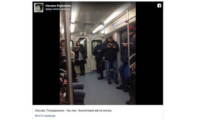 Снимка от метрото в Москва предизвика бурни дискусии у нас. Според информацията, която бе споделена в социалните мрежи, кадърът е заснет миналия понеделник в пиков час. Снимката показва пътници, които докато се возят, четат книги. Повечето от тях са правостоящи.