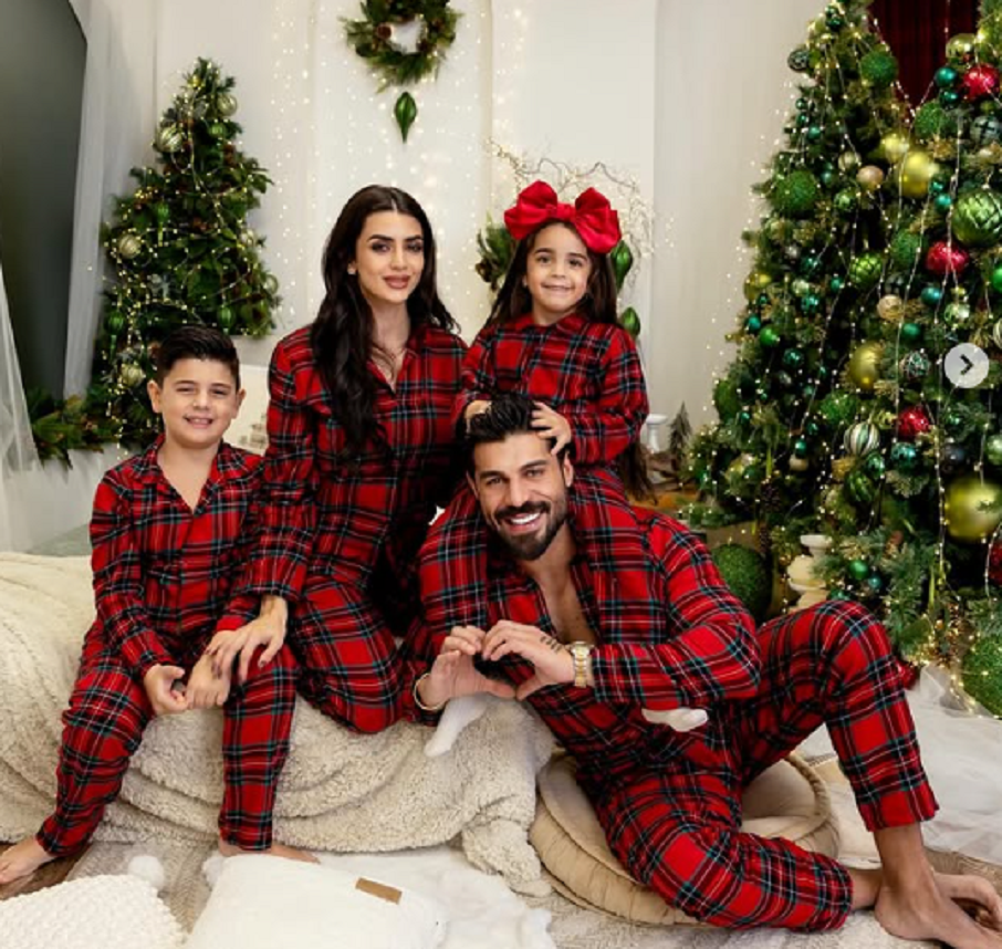 На снимката певецът е заедно със съпругата си и двете им деца, облечени в еднакви празнични пижами. Фонът е изпълнен с коледни светлини и украсени елхи, създаващи истинска празнична магия.