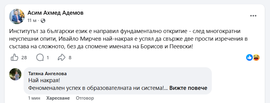 "Институтът за български език е направил фундаментално откритие - след многократни неуспешни опити, Ивайло Мирчев най-накрая е успял да свърже две прости изречения в състава на сложното, без да спомене имената на Борисов и Пеевски!", написа Асемов в социалата мрежа.
