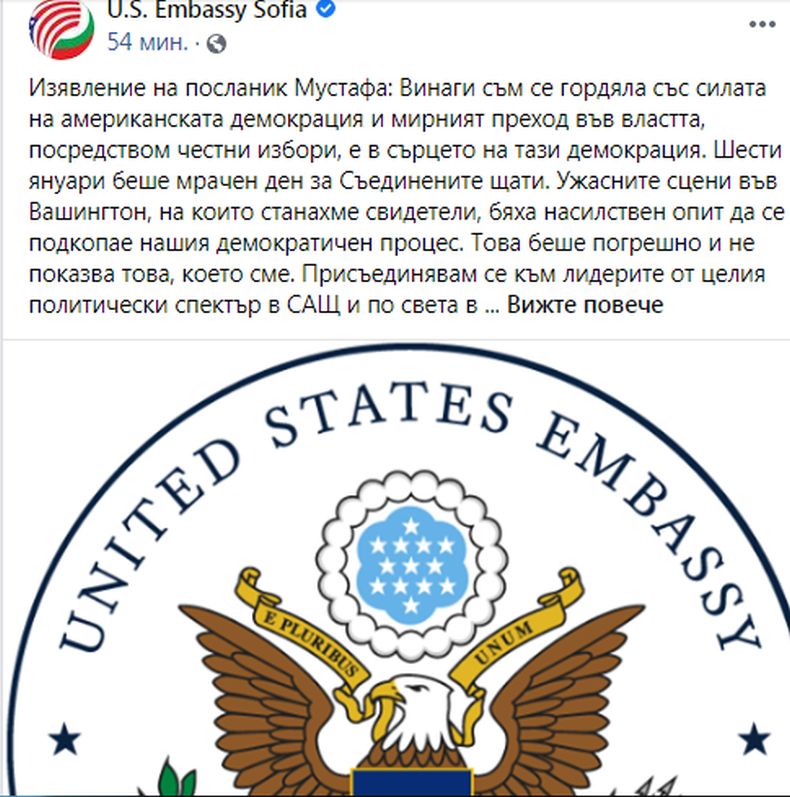 Шести януари беше мрачен ден за Съединените щати, отбелязва посланикът. "Ужасните сцени във Вашингтон, на които станахме свидетели, бяха насилствен опит да се подкопае нашия демократичен процес. Това беше погрешно и не показва това, което сме", заявява тя. Присъединявам се към лидерите от целия политически спектър в САЩ и по света в заклеймяването на тези действия, декларира Херо Мустафа.