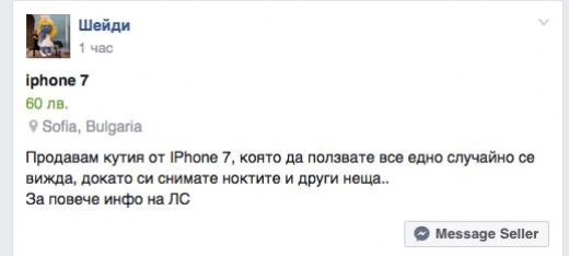 Изобретателен млад мъж е решил да се отърве от кутията си от Айфон 7, но не безплатно, а срещу пари. Той е пуснал обява във Фейсбук и сайт за малки обяви.