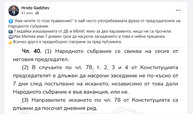 "Ама четете го този правилник!" е най-често употребяваната фраза от председателите на Народното събрание. Гледайки изказванията от ДБ и ИБНИ, явно за два парламента, нищо не са прочели. Това коментира на страницата си във Фейсбук Христо Гаджев от ГЕРБ, иронизирайки гафовете в пленарна зала на "късия" 46-ти парламент и напъните да се свърши "работа" в последния момент на преброените часове до края на това Народно събрание.
