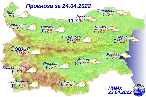 По Черноморието ще е предимно слънчево. Ще духа слаб, след обяд до умерен вятър от юг-югоизток. Температурите ще се повишат още и максималните ще бъдат между 19 и 23 градуса. Температурата на морската вода е 8-11 градуса. Вълнението на морето ще бъде 2-3 бала.
