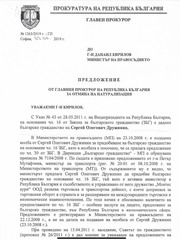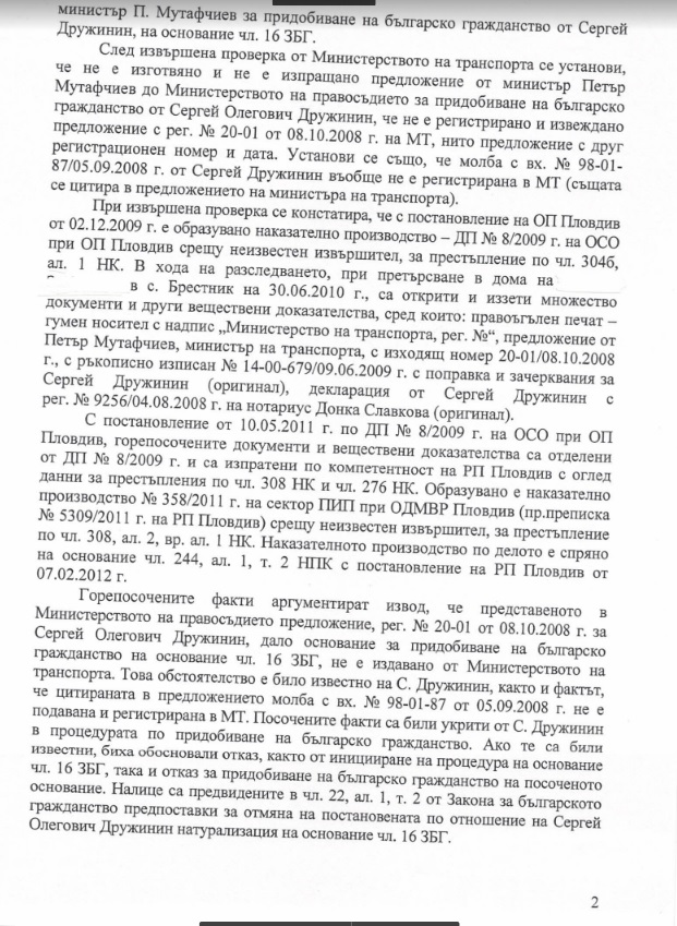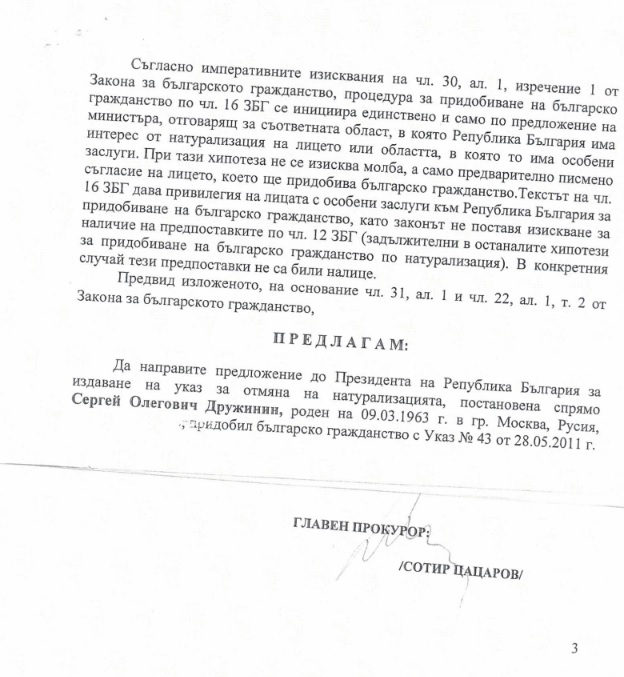 - Сергей Олегович Дружинин, гражданин на Руската федерация, придобил българско гражданство с указ от 28.05.2011 г., поради укриване от него на факти, които биха послужили като основание за отказ за придобиване на наше гражданство;