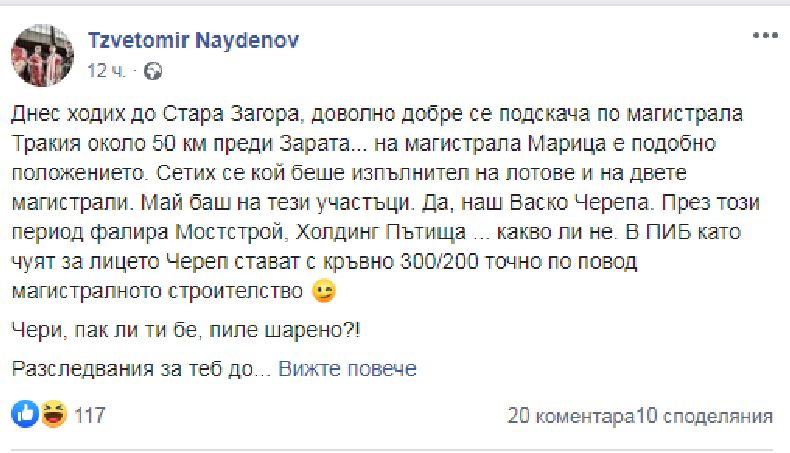 "В ПИБ, като чуят за лицето Череп, стават с кръвно 300/200 точно по повод магистралното строителство. Като пътуваме до морето или Турция подскачайки, да си спомним за Черепа-строител с любов!", това написа в профила си във "Фейсбук" Цветомир Найденов. Постът му е отправен към Васил Божков.