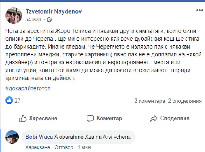 "Черепчето е излязло пак с някакви претоплени манджи, старите картинки", написа в профила си във "Фейсбук" Цветомир Найденов. Постът му е по повод вчерашната новина, че присъдружните на Васил Божков крими босове Иво Пифа, Наско Гаргата и Жоро Тениса са арестувани, за което ПИК първа съобщи.
