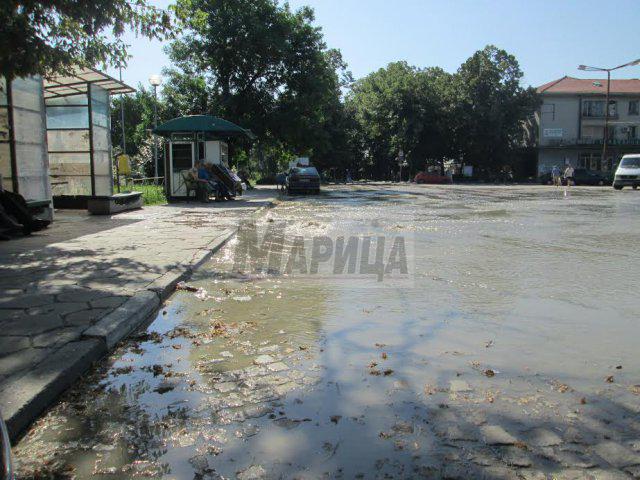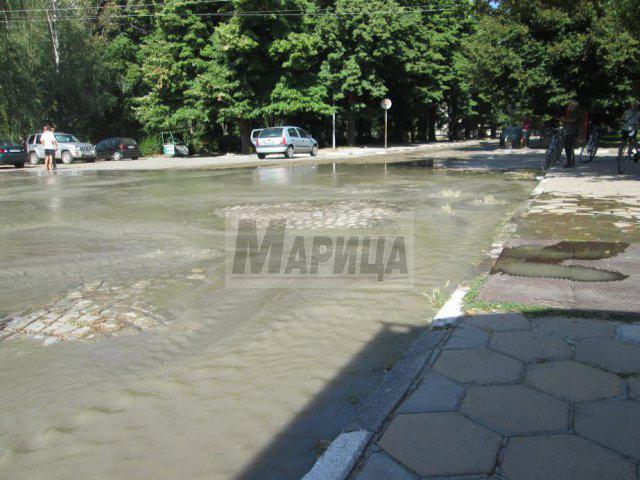 Площадът на курортното градче Баня тази сутрин неочаквано бе залят от вода. От седем-осем места под паветата бликнаха своеобразни фонтани. Водата шуртеше силно и бързо превърна целия център в езеро, пълно с кална вода.