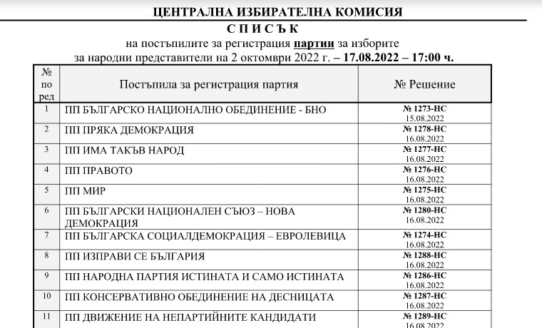 Централна избирателна комисия информира, че до 17:00 ч. на 17.08.2022 г. за участие в изборите за народни представители на 2 октомври 2022 г. са подали документи за регистрация 24 партии и 7 коалиции, съгласно приложения списък: