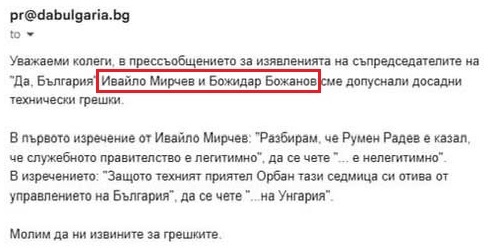 "Уважаеми колеги, в прессъобщението за изявленията на съпредседателите на "Да, България" Ивайло Мирчев и Божидар Божанов сме допуснали досадни технически грешки.