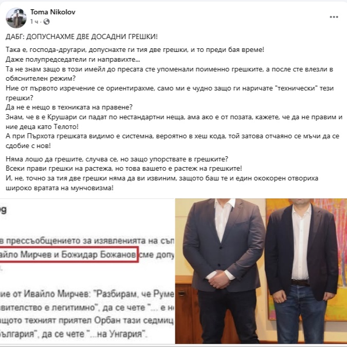 ЦИРК! Пресцентърът на Да, България сгафи жестоко, Мрежата взе на подбив съпредседателите Мирчев и Божанов (СНИМКА)