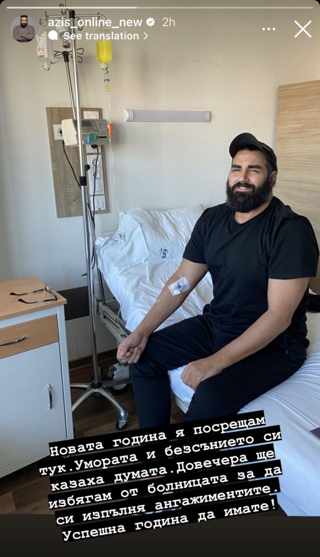 "Ей така се празнува новата година. Довечера ще избягам от тук, за да си свърша ангажиментите", пише Азис под кадъра от болничното легло.