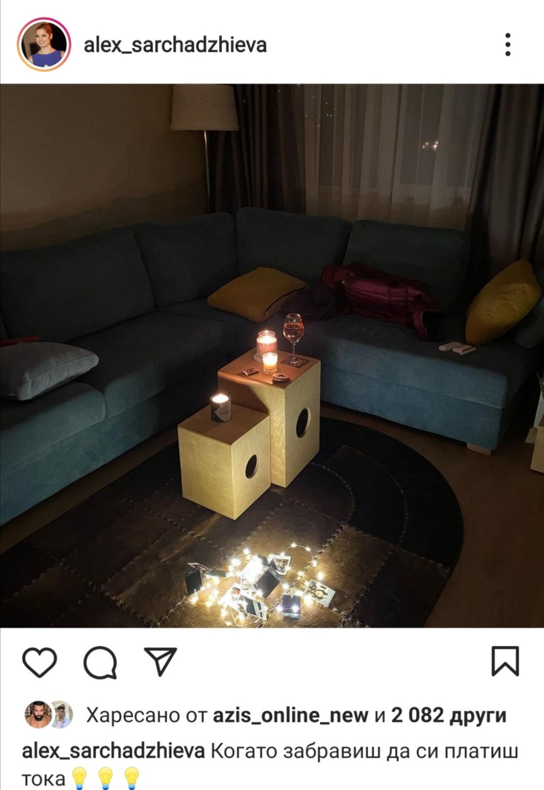 "Когато забравиш да си платиш тока", написа Алекс към кадър, в който е осветила тъмната дневна на апартамента си с три свещи и лампички за коледна елха.