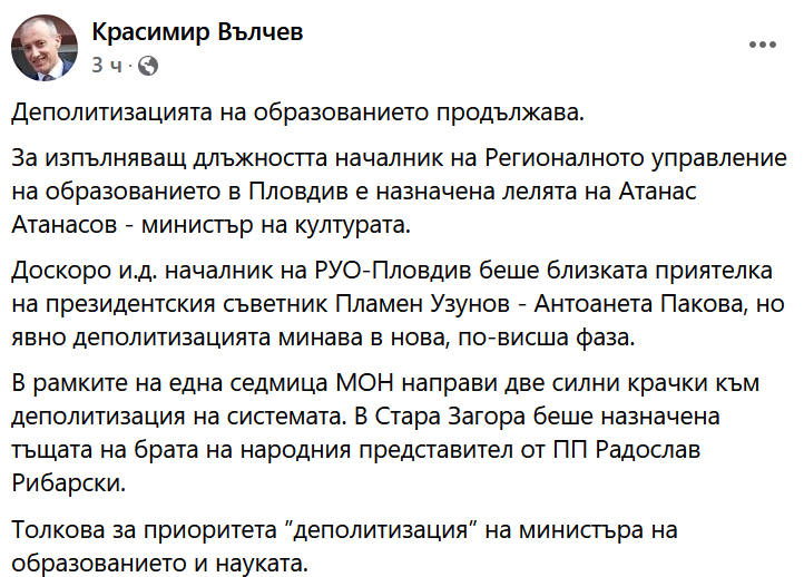 Деполитизацията на образованието продължава. За изпълняващ длъжността началник на Регионалното управление на образованието в Пловдив е назначена лелята на Атанас Атанасов - министър на културата. Това пише на стената си във Фейсбук бившият образователен министър от ГЕРБ Красимир Вълчев.