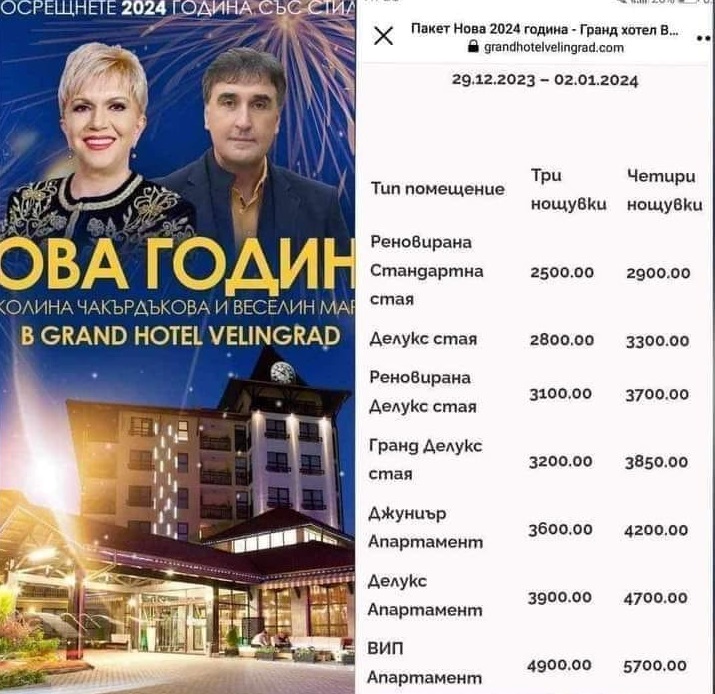 В новогодишната нощ пък гостите ще бъдат забавлявани от българските изпълнители Веселин Маринов и Николина Чакърдъкова. Сред луксозните предложения за празника отново във Велинград има оферта за купон с гръцки изпълнител.