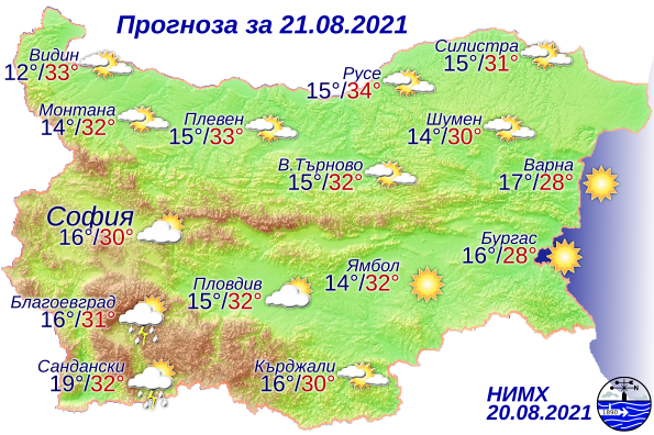 През съботния ден времето ще е предимно слънчево. Временни увеличения на облачността ще има над Югозападна България и на места там ще има краткотрайни валежи от дъжд с гръмотевици. Ще духа слаб до умерен вятър от север-североизток. Максималните температури ще са от 28° до 33°. Атмосферното налягане е близко до средното за месеца и ще остане без съществена промяна. Това съобщават от Националния институт по метеорология и хидрология (НИМХ).