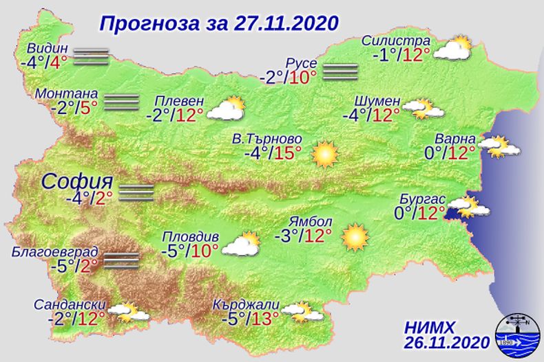 Днес времето ще продължи да се определя от антициклон. Ще се задържи тихо. В равнинната част от страната ще е облачно и мъгливо, като временно подобрение на видимостта и разкъсване на облачността ще настъпва около обяд. Над планинските райони през нощта ще бъде ясно, а през деня – слънчево. Минималните температури ще бъдат между минус 5° и 0°, а максималните – от 1°-6° в местата с трайна мъгла до 10°-14° в районите с повече слънчеви часове.
